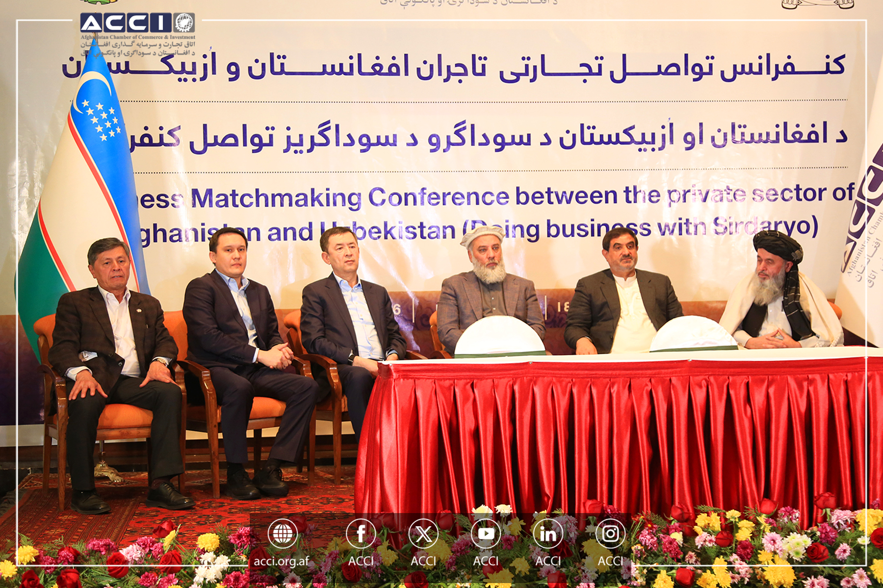 کنفرانس تواصل تجارتی تاجران افغانستان و ازبیکستان، با اشتراک محترم الحاج سید کریم هاشمی رئیس عمومی اتاق تجارت و سرمایهگذاری افغانستان، محترم الحاج نورالدین عزیزی وزیر صنعت و تجارت، معین مالی واداری وزارت اقتصاد، معاونین محترم و تعدادی از اعضای رهبری اتاق، محترم ارکین جان توردیموف، والی ولایت سر دریای ازبیکستان، ایبیک عثمانوف سفیر ازبیکستان در افغانستان و همچنان جمع کثیری از تاجران دو کشور، در کابل برگزار شد.