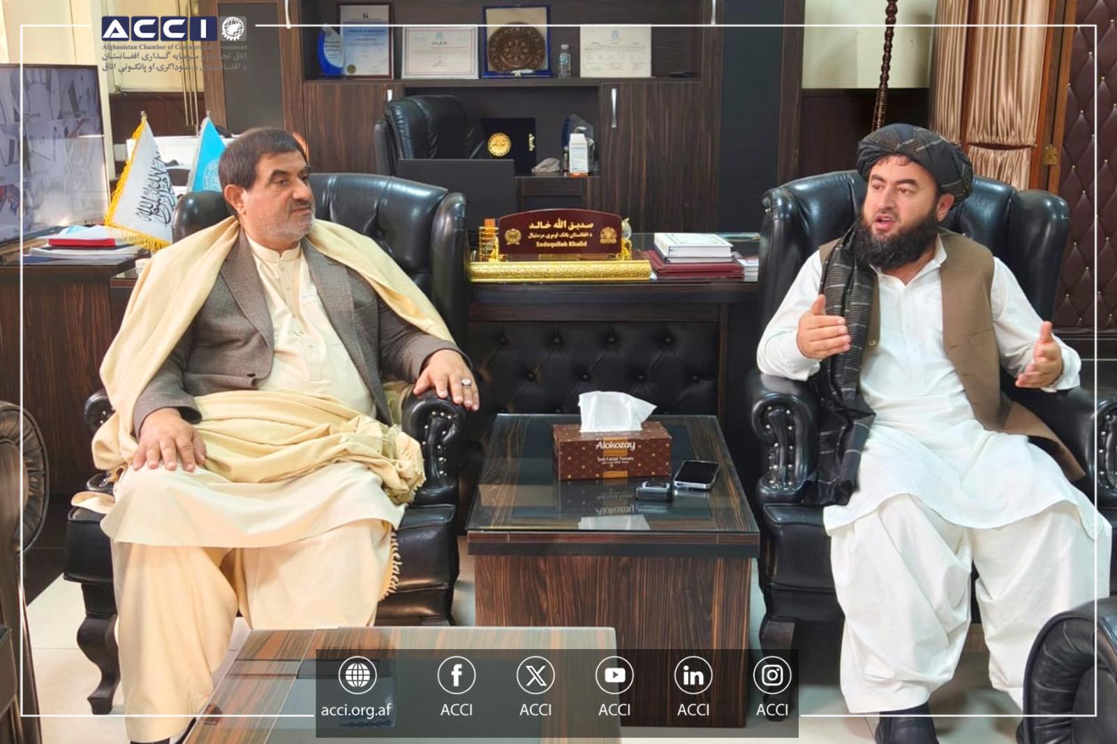 محترم الحاج سید کریم هاشمی، رئیس عمومی اتاق تجارت و سرمایهگذاری افغانستان، با محترم صدیقالله خالد، معاون اول د افغانستان بانک، ملاقات کرده و پیرامون مشکلات سکتور خصوصی، به ویژه انتقالات پول به خارج از کشور و سرمایهگذاری روی پروژههای بزرگ زیربنایی، بحث و گفتگو نمودند.