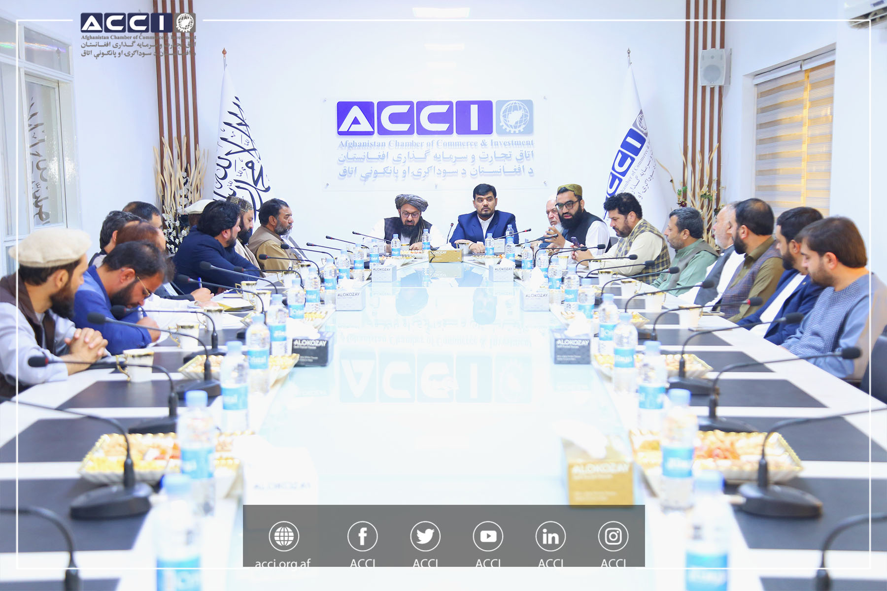 محترم محمد یونس مهمند معاون اول اتاق تجارت و سرمایه گذاری افغانستان، در حضورداشت محترمان: شیرین آغا سخی رئیس مالی هیات مدیره، خانجان الکوزی، جان آقا صادقی اعضای هیات مدیره اتاق، میرویس هوتک سرپرست ریاست هیات عامل، محمد انور عارفی معاون پالیسی و تخنیکی هیات عامل اتاق و همایون خواجه زاده معاون تجارتی اتاق کابل، با رهبری اتحادیه ترانسپورت، در دفتر مرکزی اتاق ملاقات کرده، مشکلات شان را، استماع نمود.