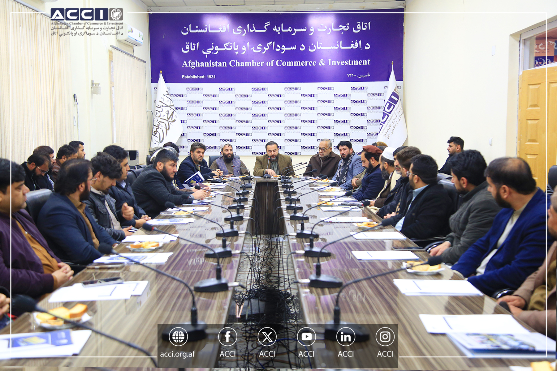 محترم محمد ولی امینی، رئیس هیئت عامل اتاق تجارت و سرمایه‌گذاری افغانستان، باهیئت همراه شان در نشستی که تحت ریاست محترم ملا عبدالمنان عمری، وزیر کار و امور اجتماعی کشور، پیرامون تطبیق هدایت شفاهی عالیقدر امیرالمؤمنین حفظه‌الله و به‌منظور رسیدگی به چالش‌ ها و مشکلات فرا راه سکتور خصوصی در زمینه روند و نوبت وسایط نقلیه باربری، در مقر وزارت کار و امور اجتماعی تدویر یافته بود، اشتراک ورزیدند.