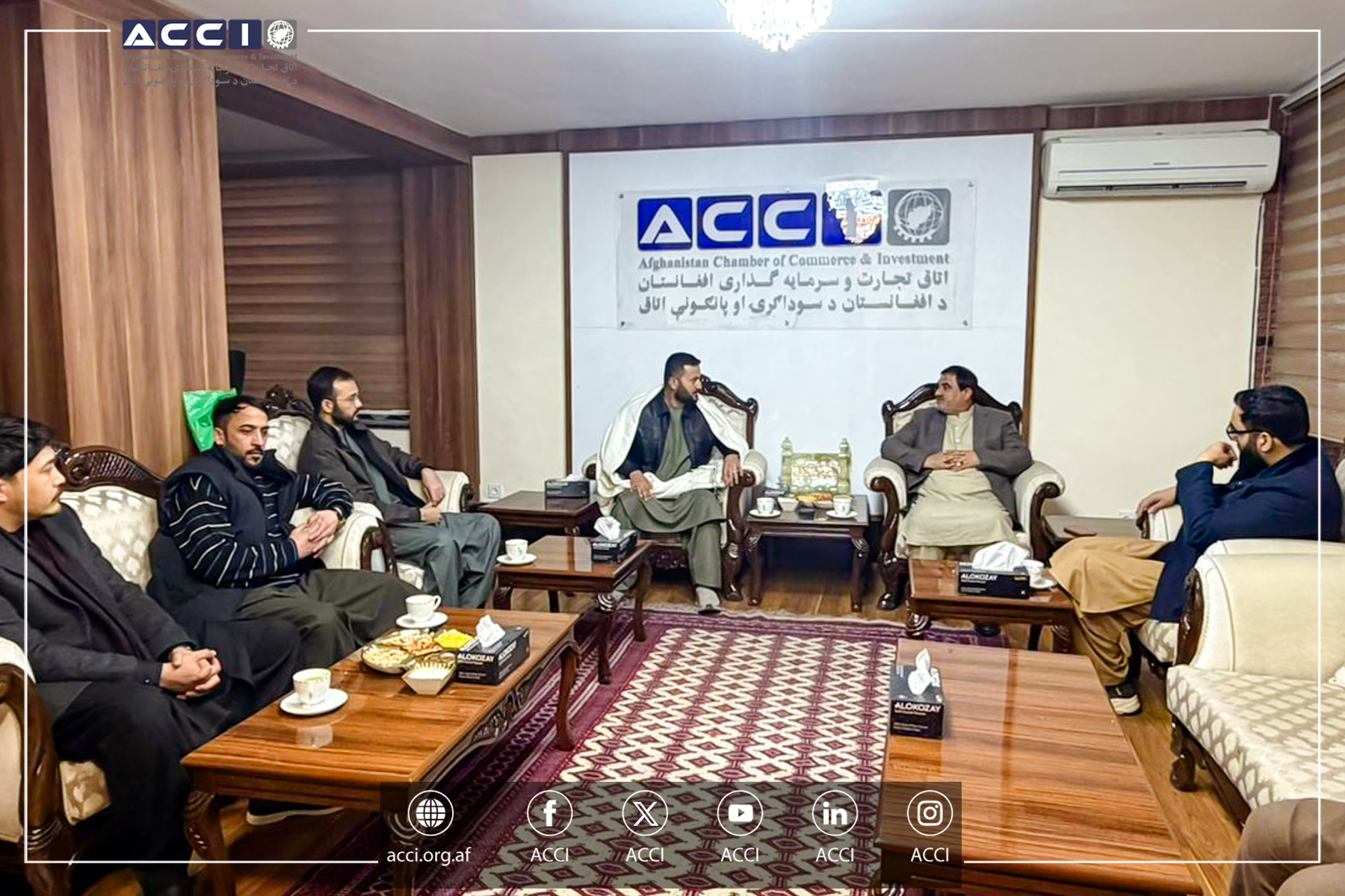 محترم الحاج سید کریم رئیس عمومی اتاق تجارت و سرمایهگذاری افغانستان با محترم حاجی ابوبکر باهر، رئیس شرکت باهر سلام و باهر کیهان، محترم حاجی پاینده رحیمی، رئیس شرکتضیافت و رستورانت ضیافت و تیم همراه شان، در ریاست عمومی اتاق دیدار و گفتوگو نمود.