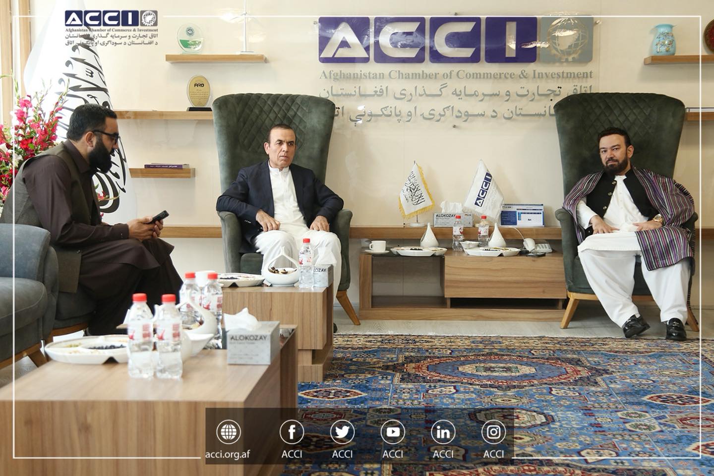 محترم آرین زلگی اعظمی معاون سرمایه گذاری اتاق تجارت و سرمایه گذاری طی ملاقات های جداگانه با تعدادی از فابریکه داران و تاجران مطرح کشور هر یک محترمان: حاجی مایل خیرخواه، جلاالدین سعید، حاجی قیس، حاجی میرویس و حاجی کریم جان در دفتر مرکزی اتاق ملاقات کرد.