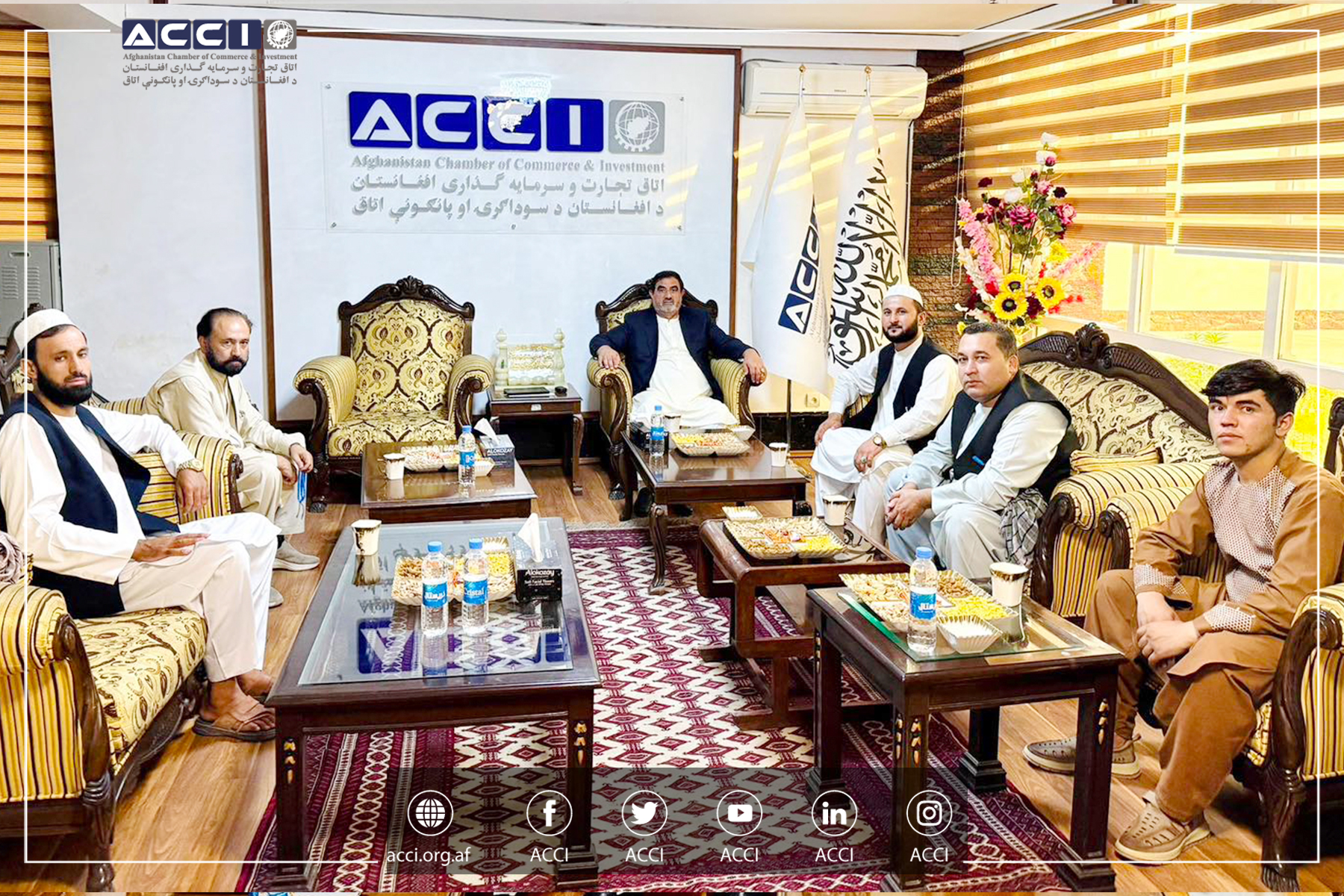 محترم الحاج سید کریم هاشمی رئیس عمومی اتاق تجارت و سرمایه گذاری افغانستان، با محترم حاجی ابوبکر باهر رئیس شرکت های باهر سلام و باهر کیهان و تعدادی از اعضای رهبری اتاق تجارت و سرمایه گذاری ولسوالی اندخوی، در دفتر ریاست عمومی اتاق ملاقات کرده و روی فعالیت های اتاق مذکور و چالش های موجود، بحث و تبادل نظر صورت گرفت.