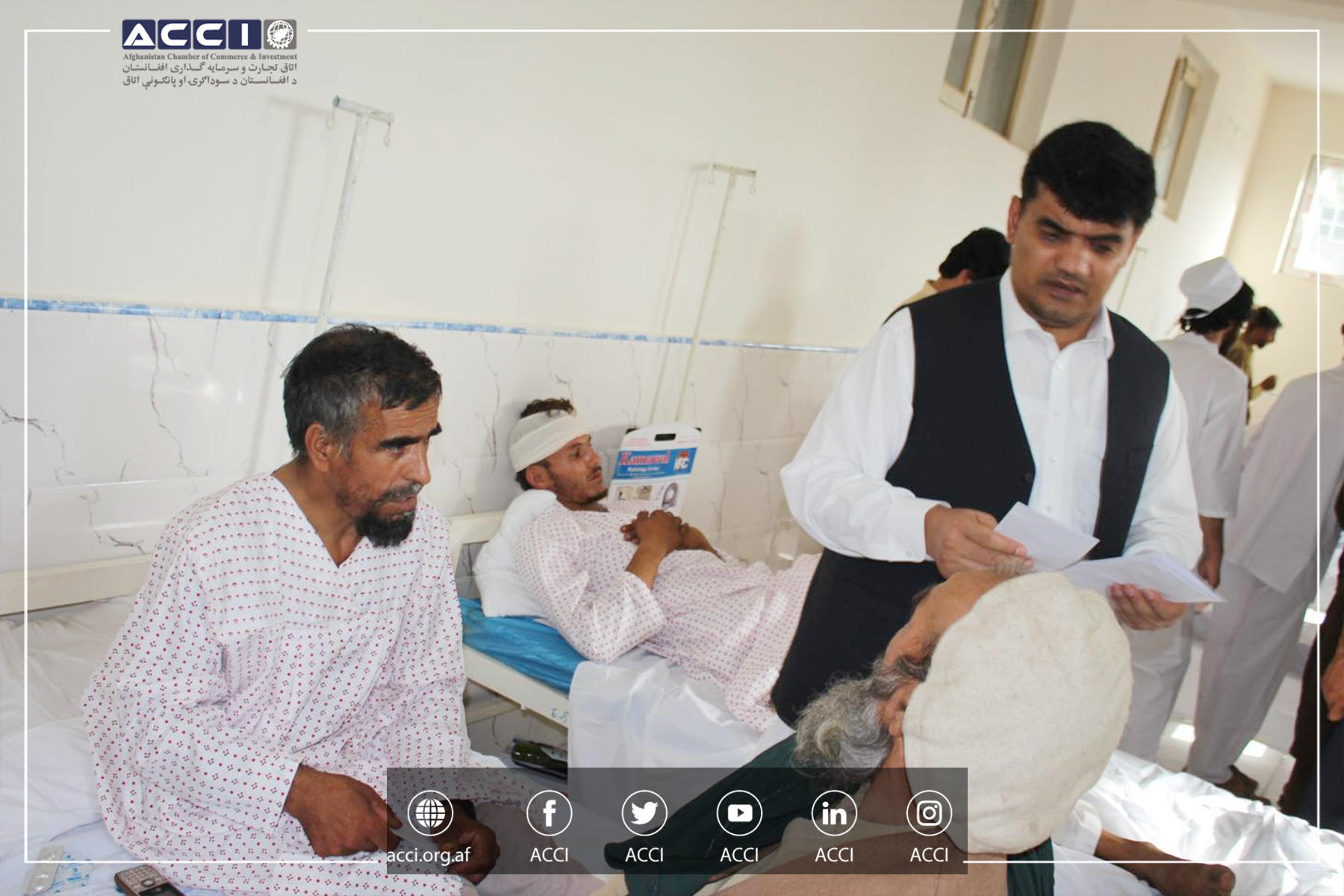 محترم عنایت الله صدیق زی، معاون خدماتی اتاق تجارت و سرمایه گذاری افغانستان و محترم عتیق‌الله مؤمن زاده عضوهیات مدیره اتاق و همچنان جمعی از تاجران ملی، در حالیکه معاون وزارت صحت عامه و رئیس صحت عامه ولایت ننگرهار ایشان را همراهی می کردند، از مجروحان زلزله اخیر در ولایات مشرقی کشور که به شفاخانه حوزوی ولایت ننگرهار و شفاخانه فاطمه الزهرا انتقال یافته اند، عیادت کرده و برایشان آرزوی سلامتی نمودند.