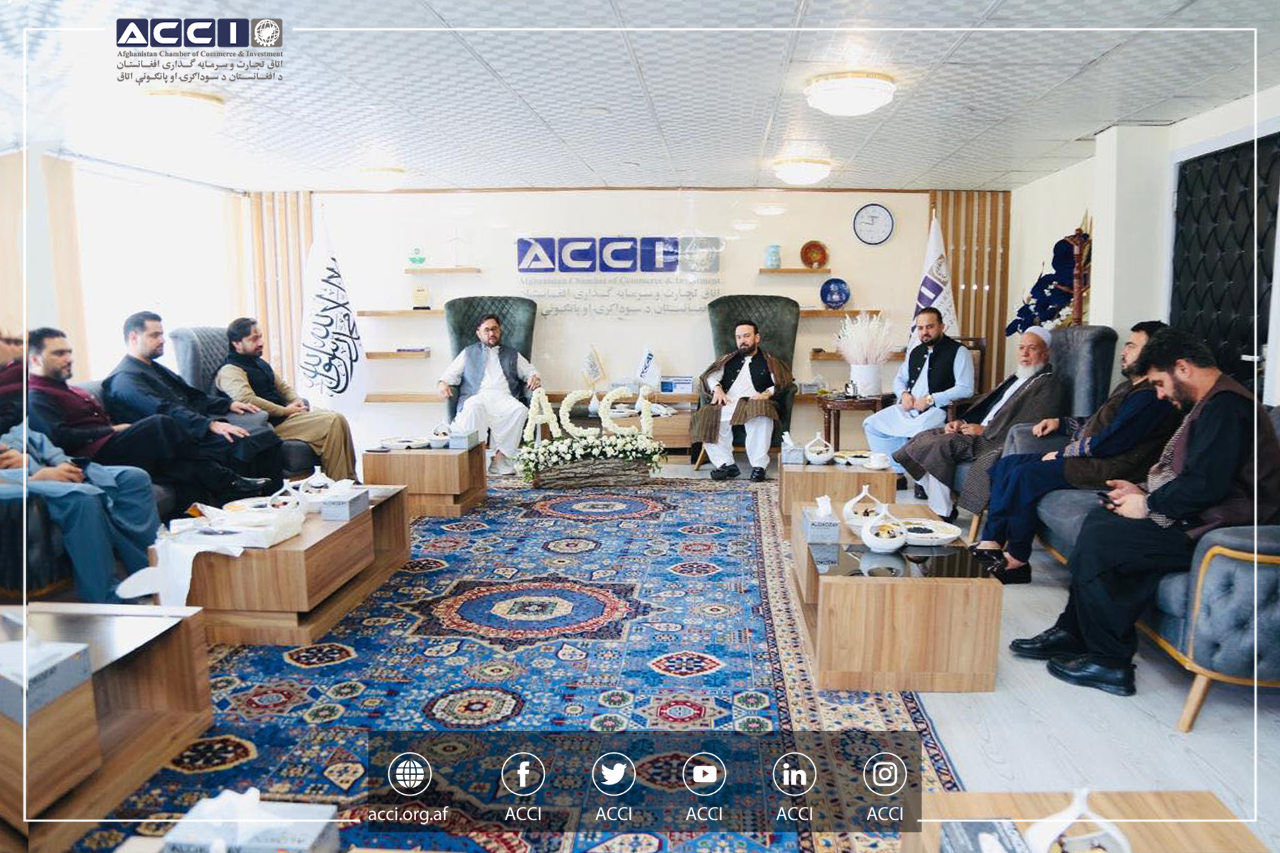 محترم آرین زلگی عظیمی معاون سرمایهگذاری اتاق تجارت و سرمایه گذاری افغانستان، با تعدادی از تاجران مطرح کشور، در دفتر مرکزی اتاق ملاقات کرده و پیرامون گسترش تجارت، چگونگی ستندر سازی صادرات افغانستان با کشور های منطقه و جهان، حمایت از سرمایهگذاریهای داخلی و تقویت همکاریهای منطقهیی بحث و تبادل نظر صورت گرفت.آقای عظیمی، نقش تاجران را در پیشبرد برنامههای اقتصادی کشور مهم خوانده و روی سرمایه گذاری مشترک به گونه سهامی در سکتور های مختلف کشور، تاکید ورزید.شنبه، 29 سنبله 1404
