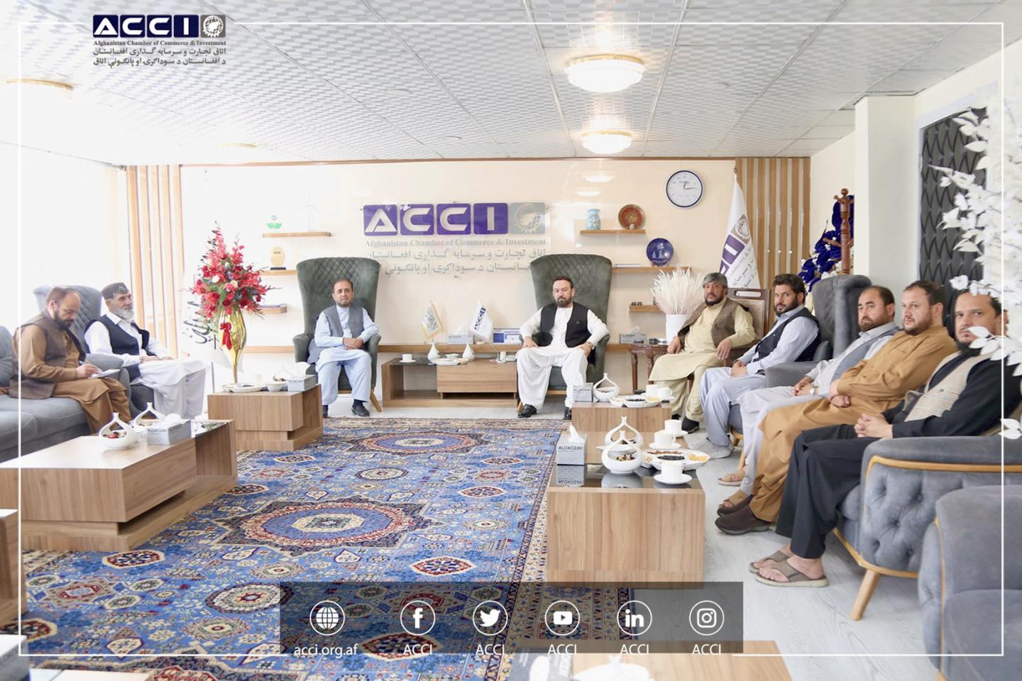 محترم آرین زلگی عظیمی معاون سرمایه گذاری اتاق تجارت و سرمایه گذاری افغانستان، با محترم احمدشاه حکیمی معاون اول اتاق تجارت و سرمایه گذاری کابل و تعدادی از اعضای رهبری آن، در دفتر مرکزی اتاق ملاقات کرده و پیرامون سرمایه گذاری ها و ارائه خدمات بهتر به سکتور خصوصی کشور، بحث و تبادل نظر صورت گرفت.