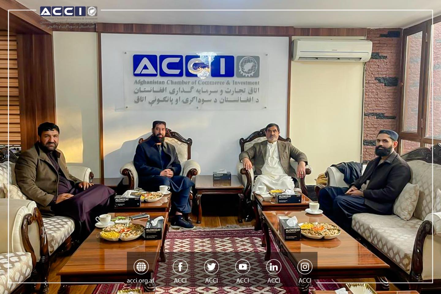 محترم الحاج سید کریم هاشمی رئیس عمومی اتاق تجارت و سرمایه گذاری افغانستان، با محترمان: الحاج احمد نبی زاده رئیس اتاق صنایع و معادن افغانستان، الحاج خان محمد وردک معاون صنعتی اتاق مذکور و الحاج ذبیح الله صنعتکار ملی، در دفتر ریاست عمومی اتاق ملاقات کرده و روی همکاری های مشترک، بحث و تبادل نظر صورت گرفت.