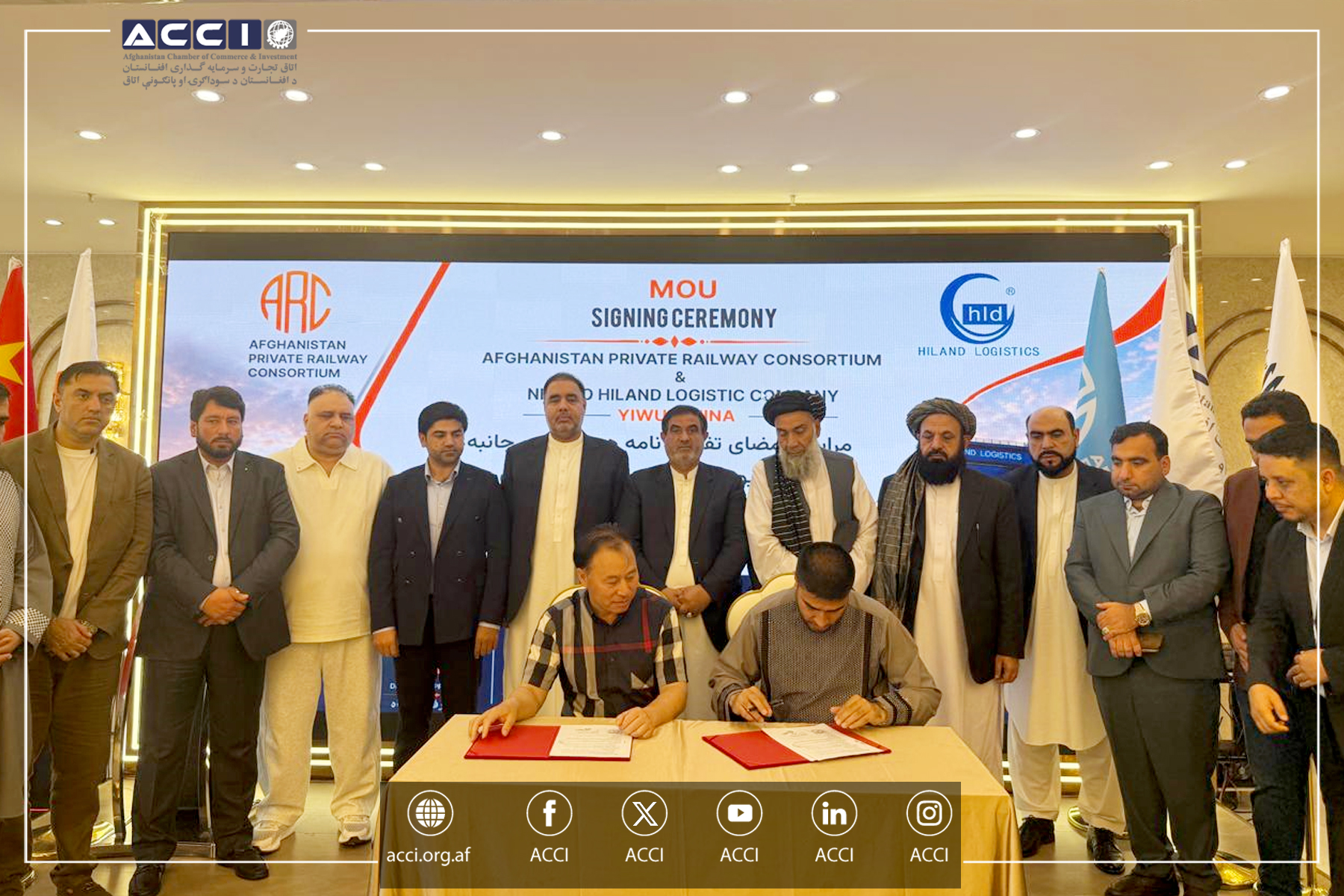 تفاهمنامه همکاری میان کنسرسیوم ریلی خصوصی افغانستان و شرکت لوژجستیکی ( لیننکیو هایلند) در حضور داشت رئیس عمومی و هیئت رهبری اتاق تجارت و سرمایهگذاری به امضاء رسید.