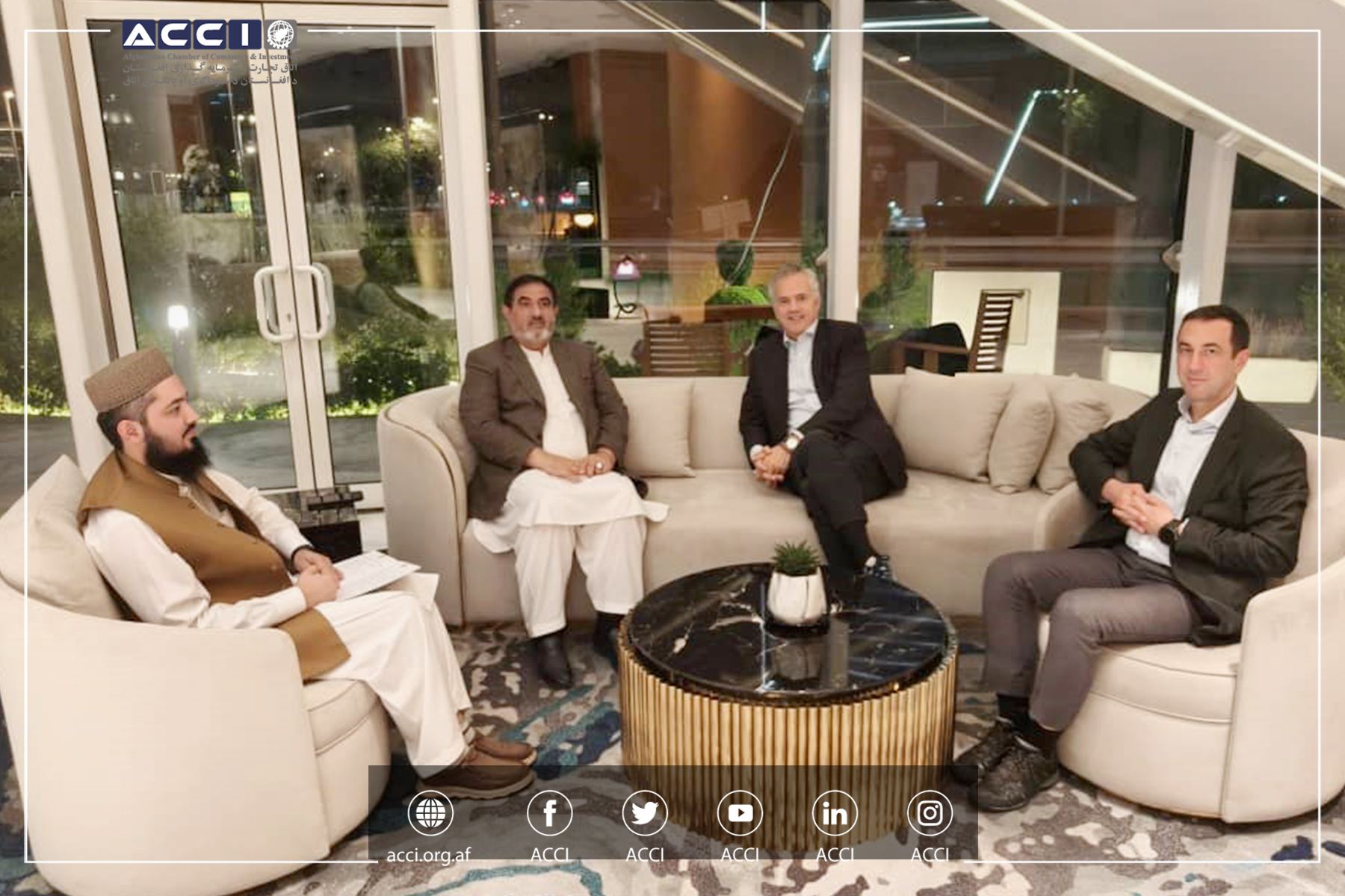 محترم توکل احمدیار رئيس عمومی اتاق تجارت و سرمایه گذاری افغانستان، در حضورداشت محترم میرویس هوتک سرپرست ریاست هیات عامل اتاق و محترم امید غفورزی مسوول روابط بین الملل اتاق در نشستی مشورتی کشور های عضو سازمان سارک اشتراک کرده و در رابطه به چالش های عمده کشور های عضو سارک و شناسایی راه های حل آن بحث و گفتگو نمود.