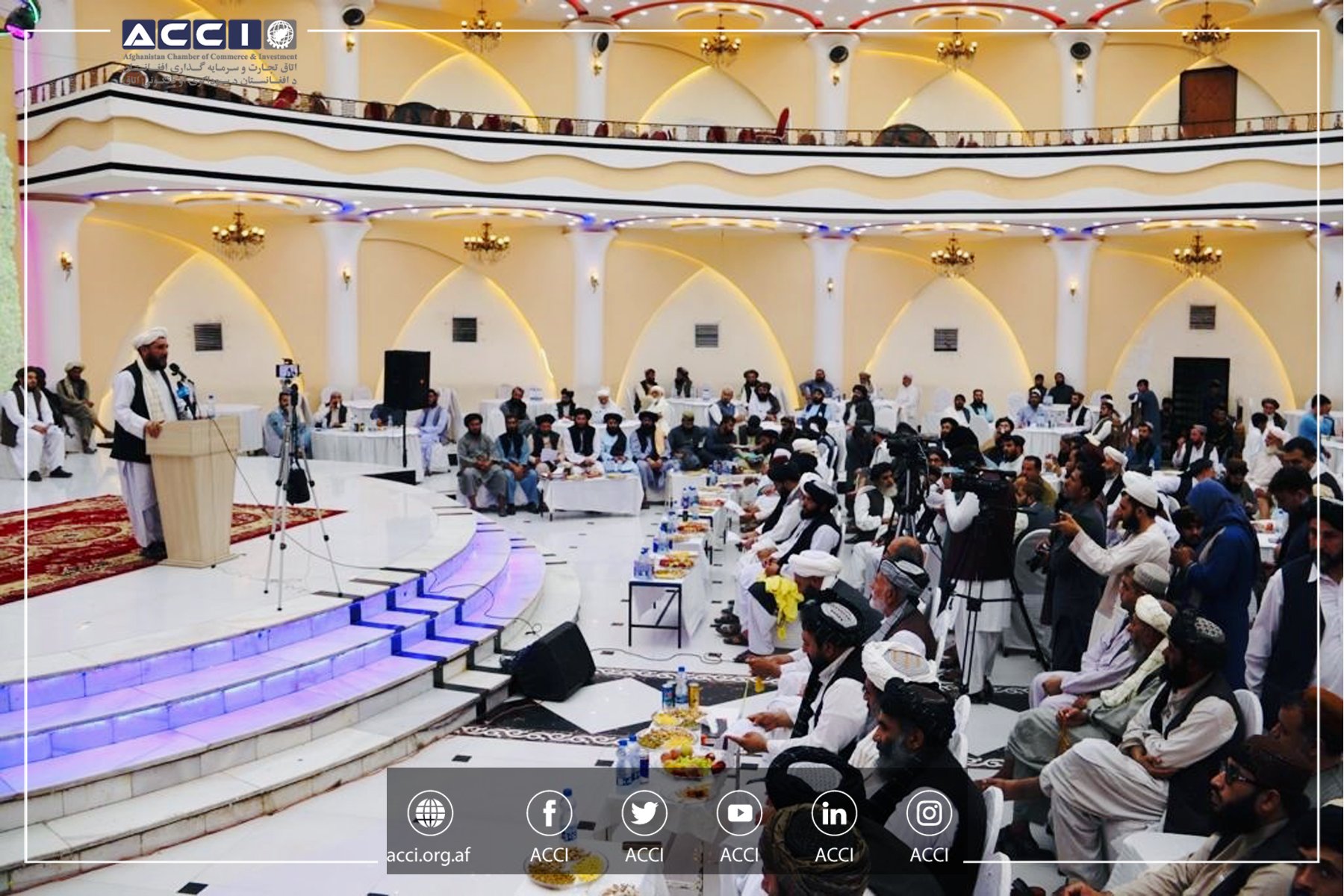 د افغانستان د سوداګرۍ او پانګونې اتاق مدیره پلاوي لومړي مرستیال ښاغلي محمد یونس مهمند، د کندهار والي ښاغلي محمد یوسف وفا، د علماوو د شورا رئیس ښاغلي مولوي حبیب الله آغا صاحب، د ماليې وزارت د ګمرکونو او عوایدو عمومي رئیس ښاغلي انجنیر محمد معراج، د مرکزي اتاق د نفتو کمېټې رئیس او مدیره پلاوي غړي ښاغلي جان آقا صادقي، د کندهار سوداګرۍ او پانګونې اتاق رئیس ښاغلي محمد صدیق مهمند، د ولایتي اتاقونو رئیسانو او د هېواد د سویل او لویدیځ حوزو سوداګرو په دی غونډه کې چې د کندهار د سوداګرۍ او پانګونې اتاق په آسمان تالار کې جوړه شوې وه، ګډون وکړ.