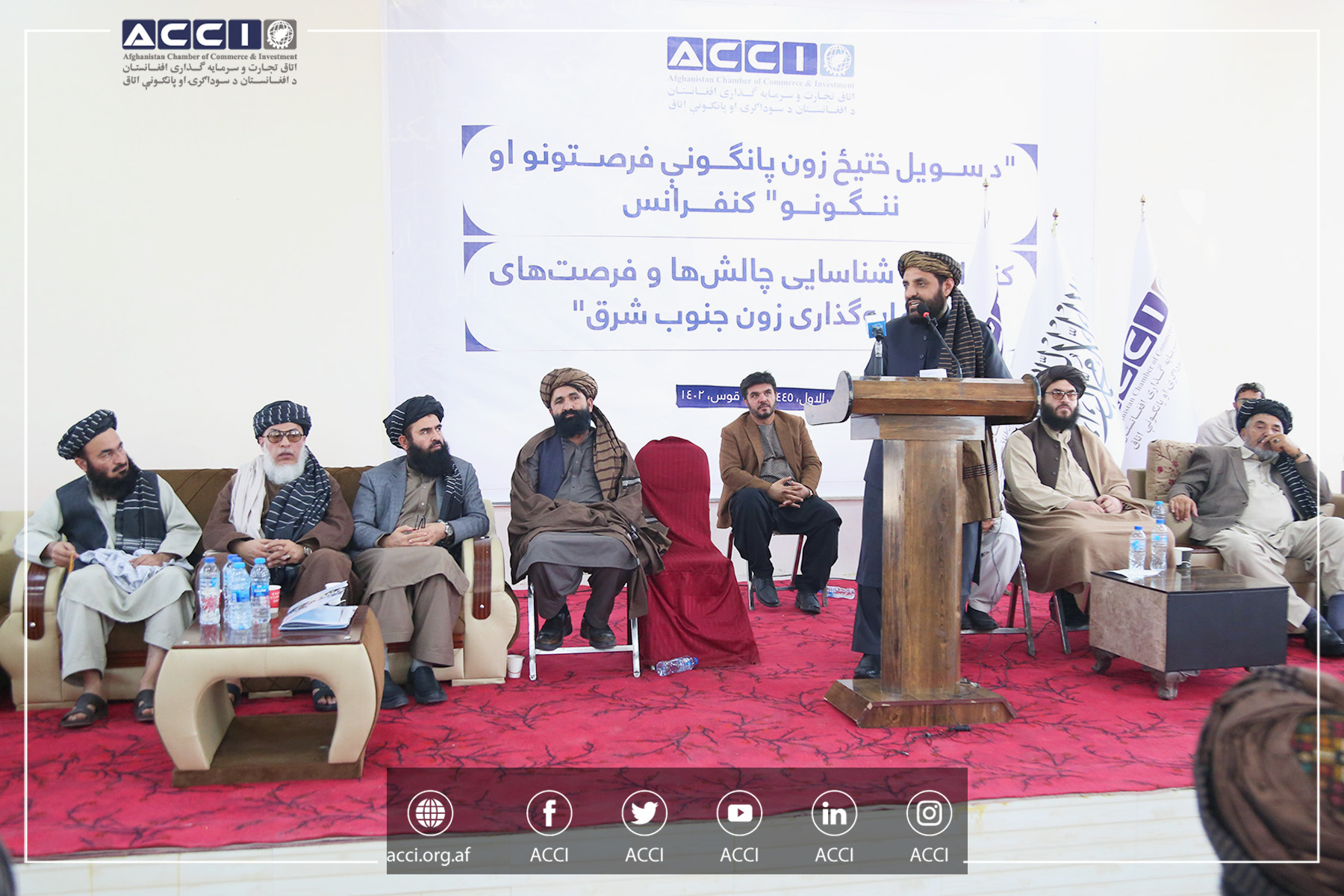د افغانستان د سوداګرۍ او پانګونې اتاق لومړي مرستیال ښاغلي محمد یونس مهمند، د اتاق دار الانشاء رئیس ښاغلي خان محمد سرفراز باز، د مدیره پلاوي غړو هر یو ښاغلي محمد ګردیزي او جان آقا صادقي، د بهرنیو چارو، کرنې، سوداګرۍ او صنعت او اقتصاد وزارتونو معینانو، د اتاق عامل پلاوي پالیسۍ او تخنیکي مرستیال ښاغلي محمد انور عارفي، د پکتیا، پکتیکا، لوګر او خوست ولایتي اتاقونو رئیسانو او د لوګر او کابل والیانو په "سویل ختیځو ولایتونو کې د پانګونې فرصتونه او ننګونې" کنفرانس کې ګډون وکړ.