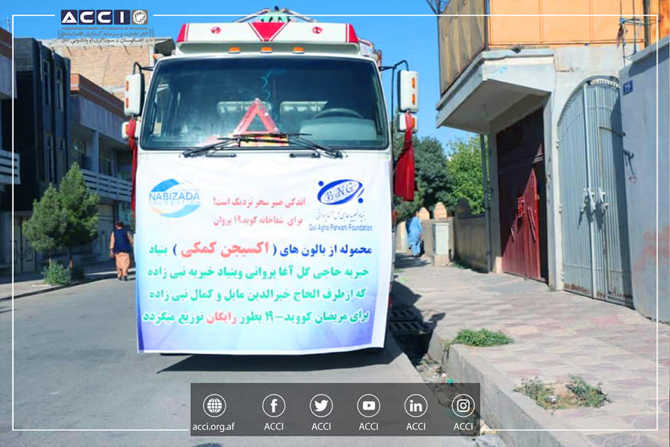 د افغانستان د سوداګرۍ او پانګونې اتاق مدیره پلاوي سوداګریز مرستیال او د حاجي ګل آغا پرواني بنسټ رئیس ښاغلي خیرالدین مایل احمدي او د نبي زاده خیریه بنسټ رئیس ښاغلي کمال نبي زاده د ازبیکستان هېواد څخه پیرودلې د اکسیجن ۱۵۰ ډبې په تخار او بدخشان کې د کویډ – ۱۹ روغتونونو ته په وړیا ډول وویشلې.